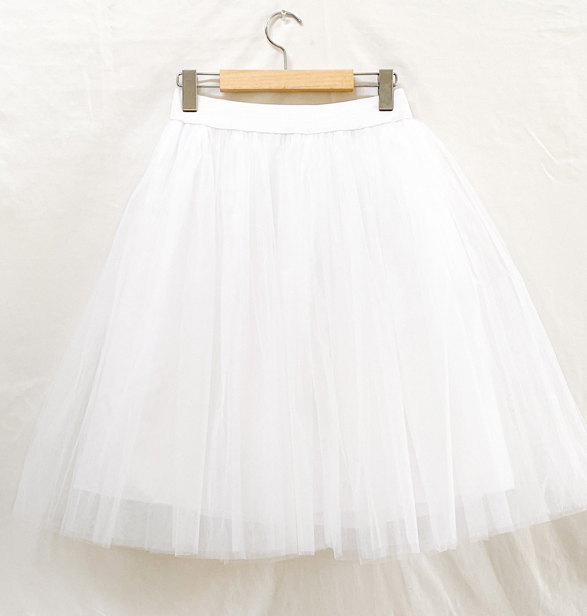 Our Camille Knee Length Tulle Skirt is so pretty. This A-Line knee length 5 layered tulle skirt is lightweight, fitted at the waist, and with silk satin lining and elastic waistband.