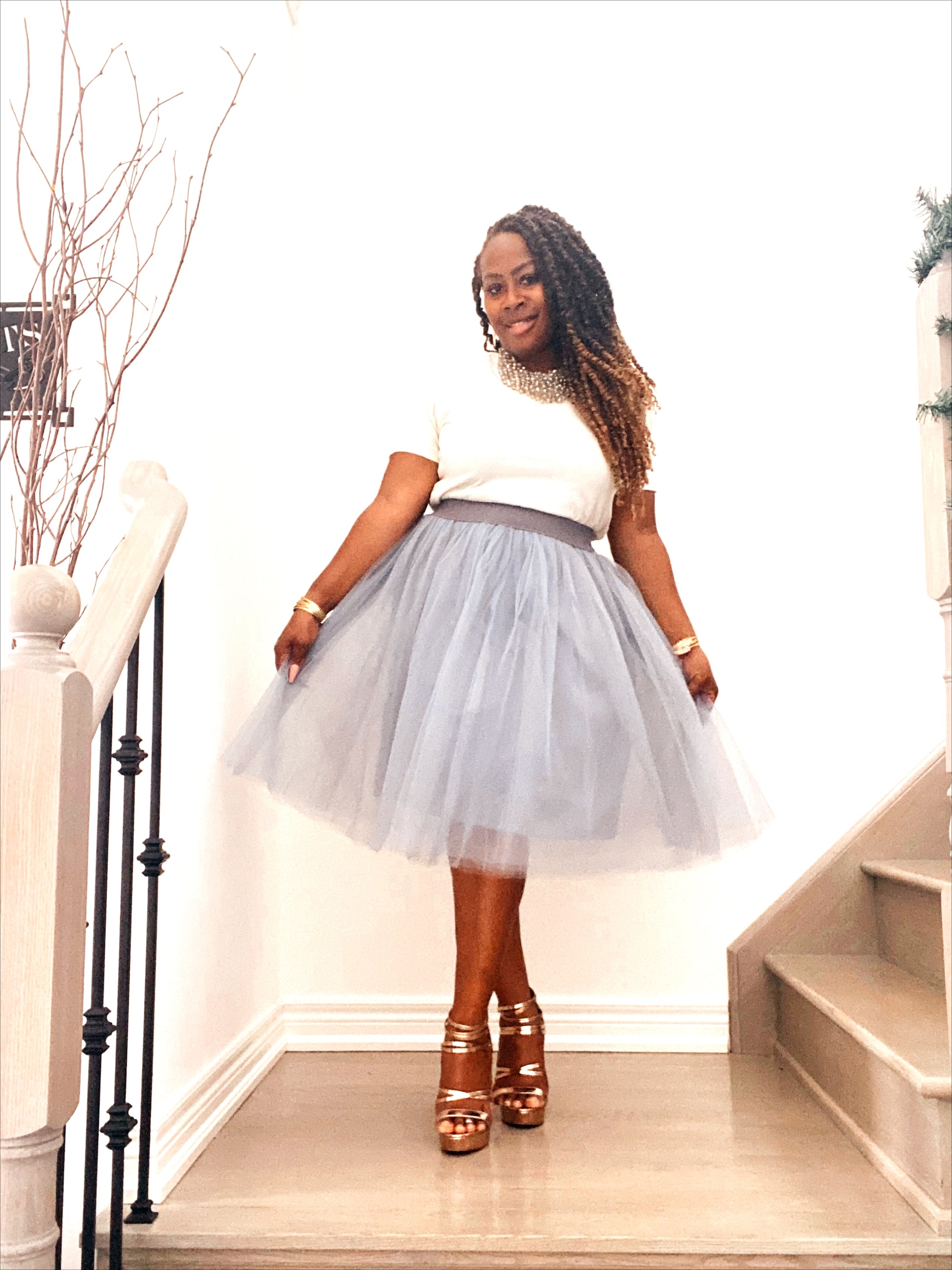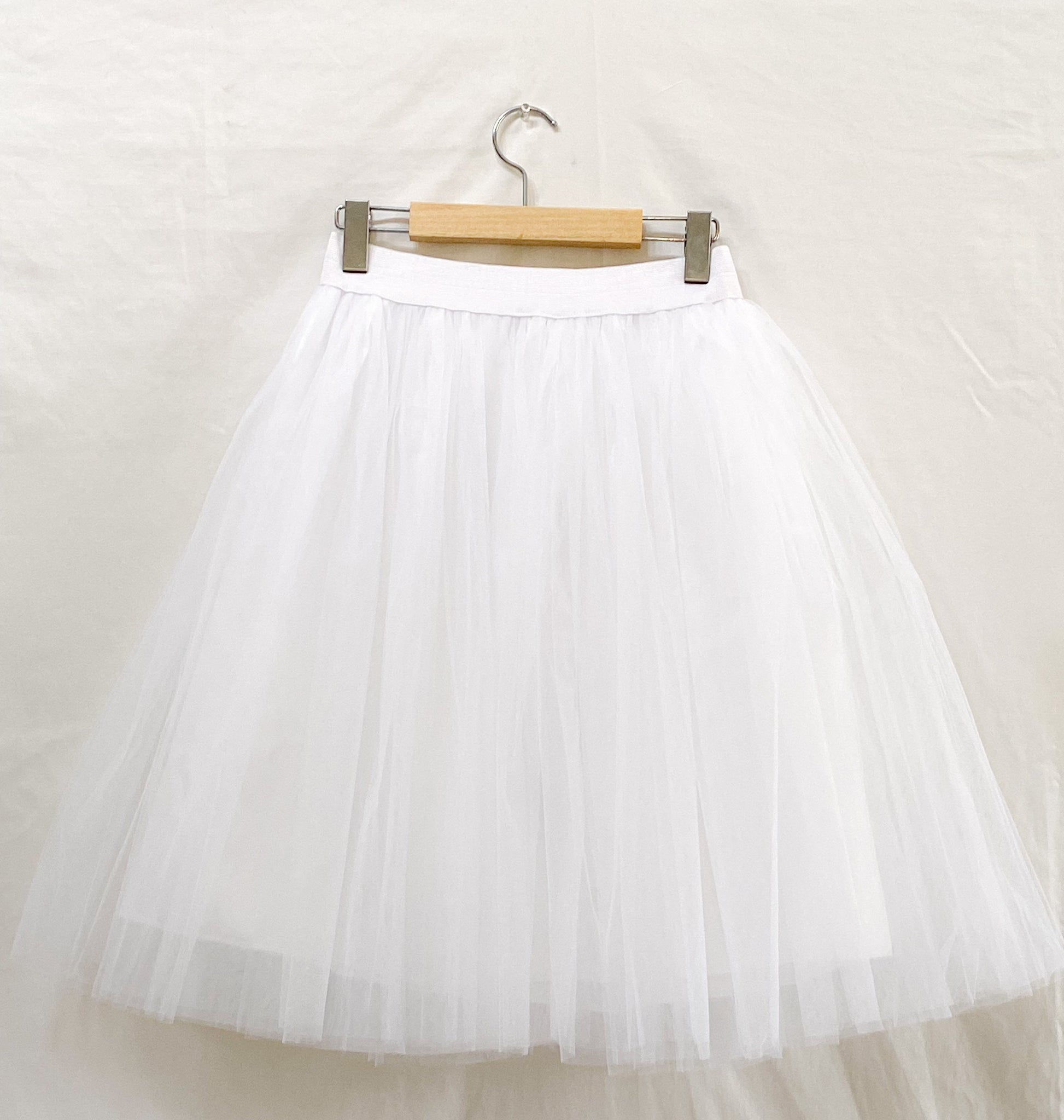 Our Camille Knee Length Tulle Skirt is so pretty. This A-Line knee length 5 layered tulle skirt is lightweight, fitted at the waist, and with silk satin lining and elastic waistband.